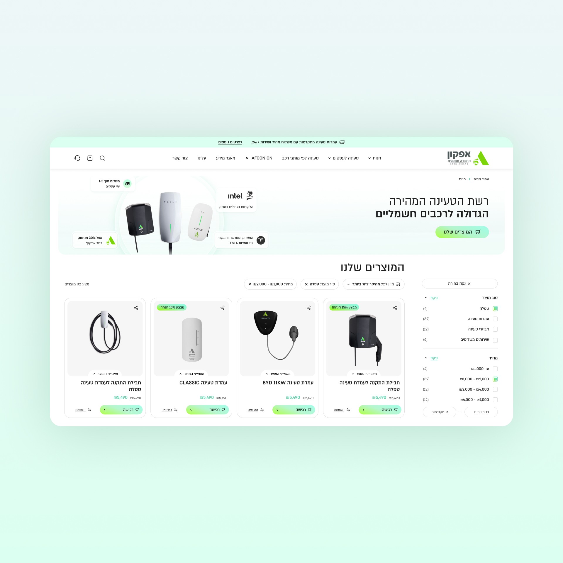 Afcon EV operates Israel’s largest public EV charging network. They needed an upgraded e‑commerce design and functionality to support enhanced features for product browsing and purchasing.