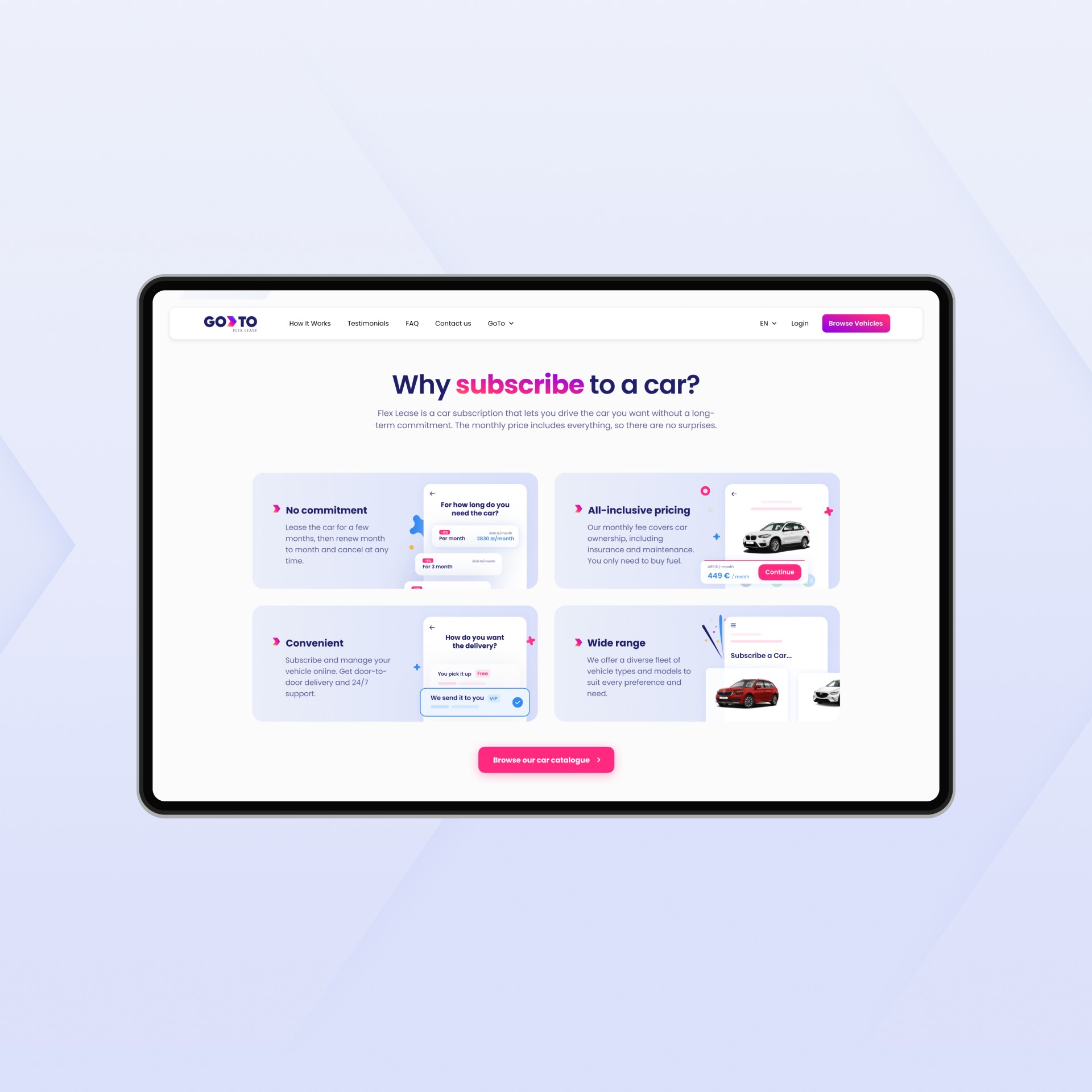 GoTo is a flexible car‑sharing service, offering an affordable, tech-driven experience for drivers across multiple cities. They needed a refreshed website and brand identity to clearly communicate their offerings and make the service feel accessible, modern, and user-friendly.